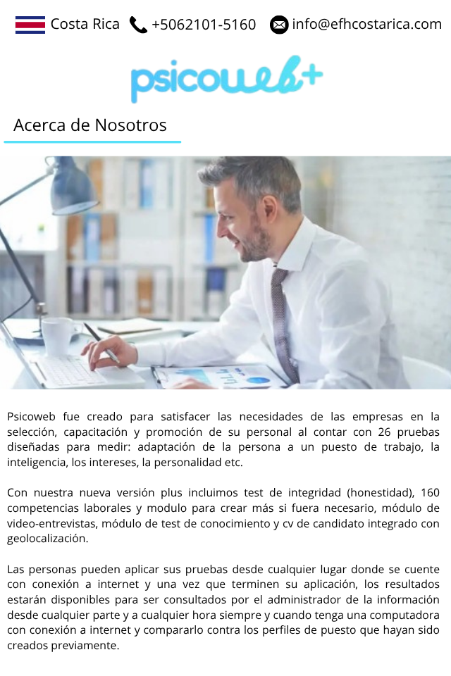 En GTI, brindamos un servicio especializado en evaluaciones psicométricas y por competencias, diseñado para apoyar a las organizaciones en la toma de decisiones estratégicas en procesos de reclutamiento, promoción interna y de desarrollo del talento humano. Con nuestra nueva versión Plus incluimos test de integridad (honestidad), 160 competencias laborales y módulo para crear más si fuera necesario, módulo de video-entrevistas, módulo de test de conocimientos y cv de candidato integrado con geolocalización.
